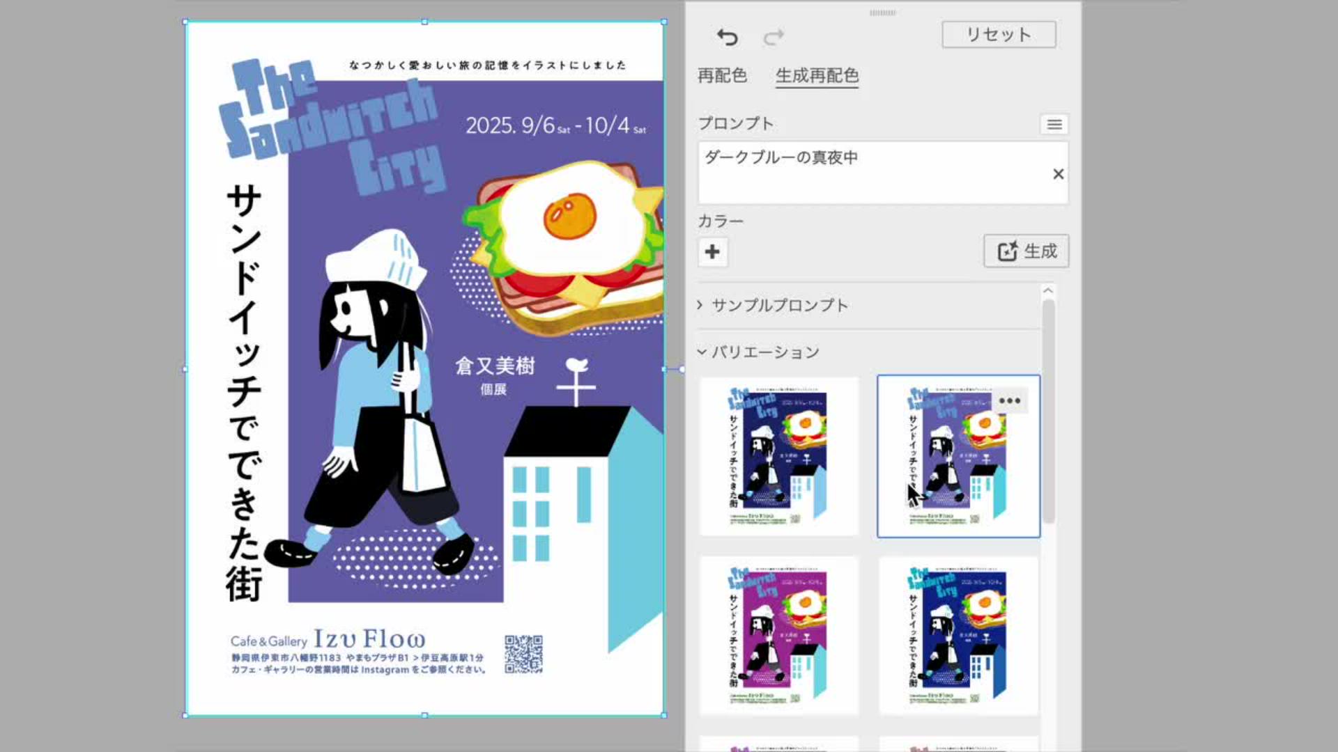 さらに画期的なのが、生成AI機能「生成再配色」です。「生成再配色」を使えば、文章で色のイメージを伝えるだけで、AIが自動的にデザインの配色を変更してくれます。