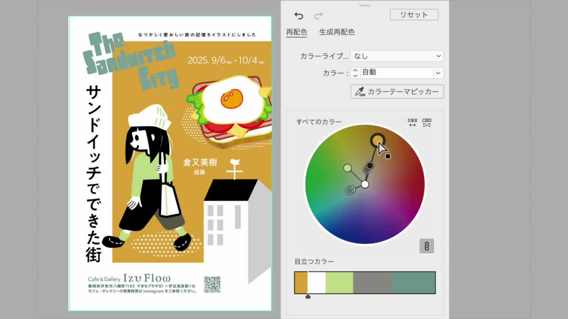 Illustratorには、作成したデザインの配色を簡単に変更できる便利な機能がたくさん用意されています。「オブジェクトを再配色」を使うことにより、カラーホイールでの直感的な再配色ができます。