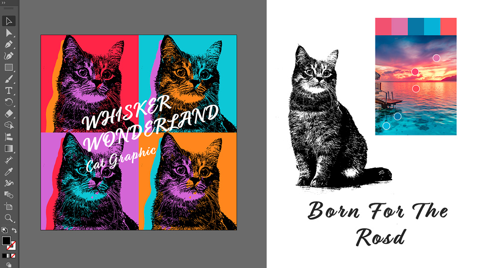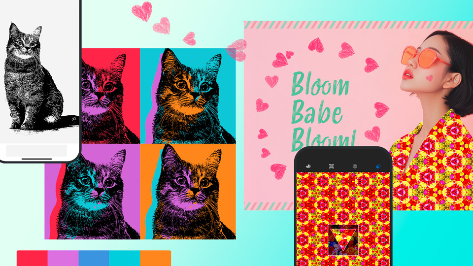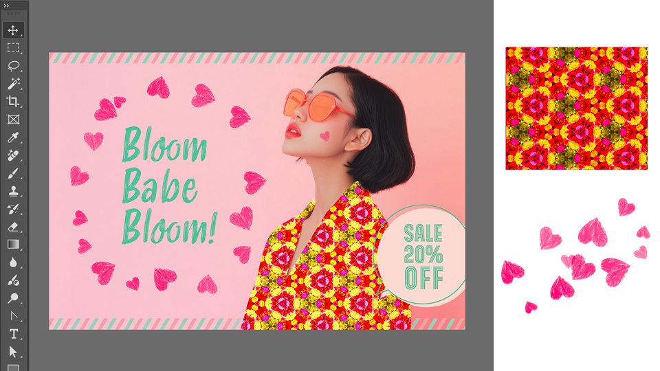 下の2つのクリエイティブは、それぞれIllustratorとPhotoshopを使って制作したものです。実は、このクリエイティブで使用されているイラスト、カラー、フォント、パターンなどの素材は、どれもAdobe Captureに取り込んだ写真や画像から作成したものです。どのように素材を作成するのかを見ていきましょう。