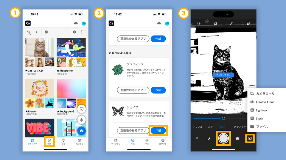 ③ キャプチャ画面で、シャッターをタップして写真を撮影するか、画像の読み込みボタンをタップし、カメラロール、Creative Cloud、Adobe Stock、Lightroomの画像にアクセスします。