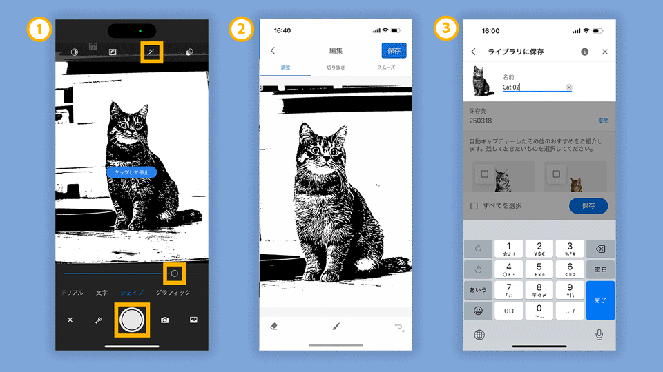 ② 画像が取り込まれたら、消しゴムツールを使って余分な要素を除去したり、画像を切り抜いたり、自動スムージングを実行したりしてシェイプを調整します。調整ができたら、「保存」をタップします。