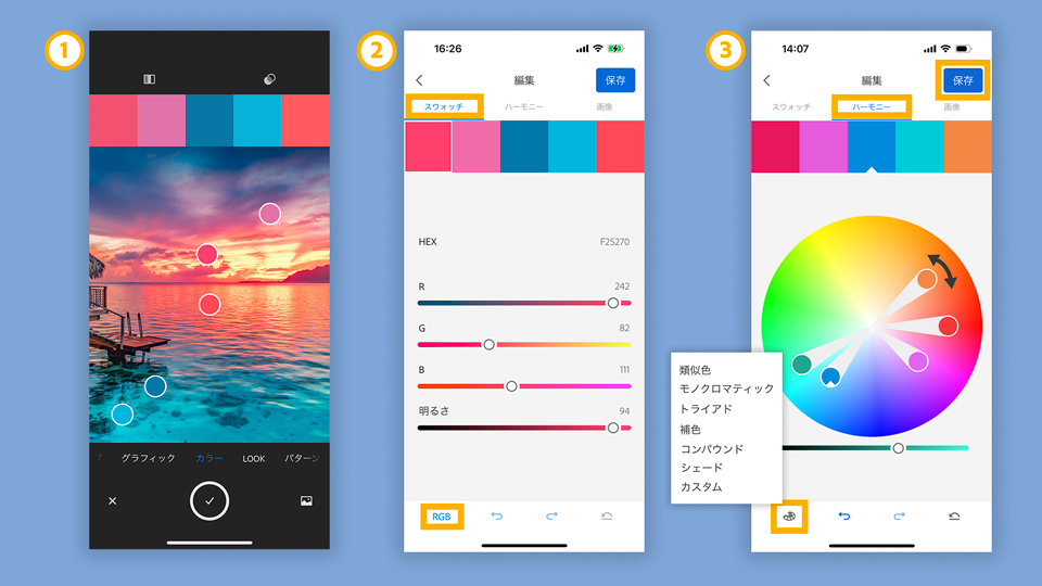 ③「ハーモニー」タブで、カラーホイール上のマーカーを動かして、選択した色と明るさの調整をおこないます。また、類似色、モノクロマティック、トライアドなどのカラーハーモニールールの選択も可能です。調整ができたら「保存」をタップして、作成した色をカラーテーマとしてCreative Cloudライブラリに保存します。