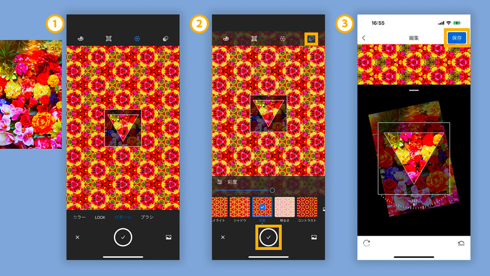 ③ 編集画面でパターンの角度を変更するなど調整したら、「保存」をタップしてCreative Cloudライブラリに保存します。