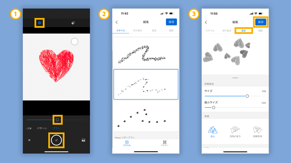 ③ 設定タブで、ブラシのサイズ、角度、間隔などの詳細を調整したら、「保存」をタップしてCreative Cloudライブラリに保存します。