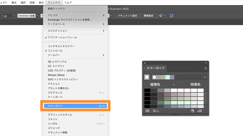 ブルーのオブジェクトを選択し、[ウィンドウ ➡ カラーガイド]からカラーガイドパネルを開きます。