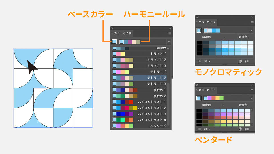 ここでは、ハーモニールールを「ペンタード」、バリエーション効果を「明清色・暗清色を表示」に設定した状態で、オブジェクトにカラーを適用していきます。