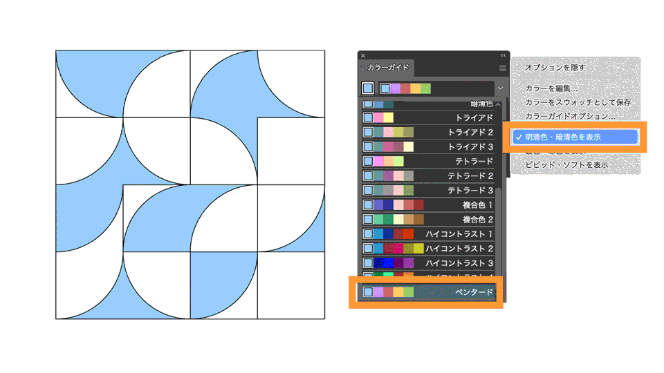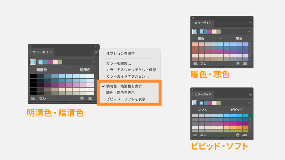 カラーガイドパネルの右上のメニューをクリックすると、3種類のバリエーション効果が選択できます。
