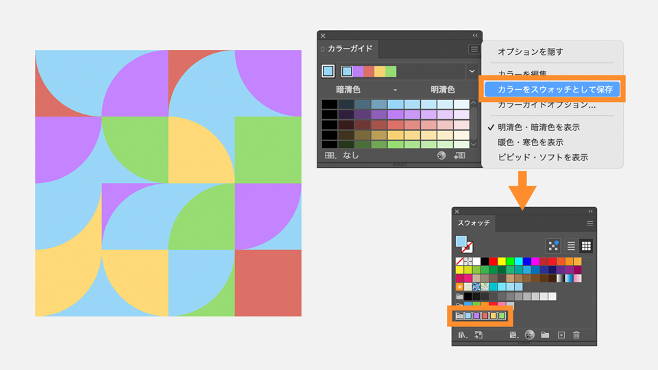 カラーガイドパネルの右上のメニューをクリックし、「カラーをスウォッチとして保存」を選択します。