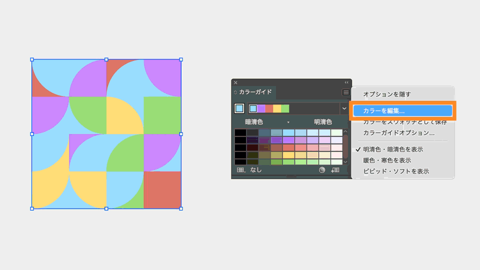 ➀ 全てのオブジェクトを選択した状態で、カラーガイドパネルの右上のメニューをクリックし、「カラーを編集」を選択します。