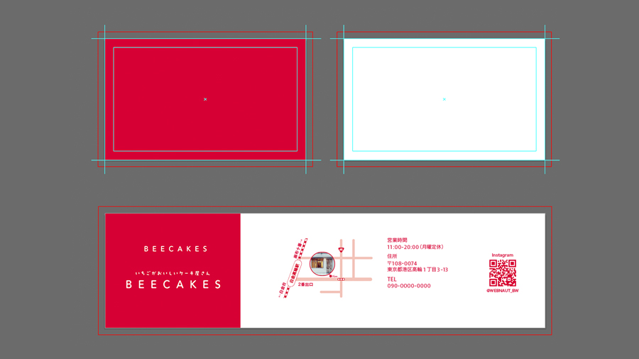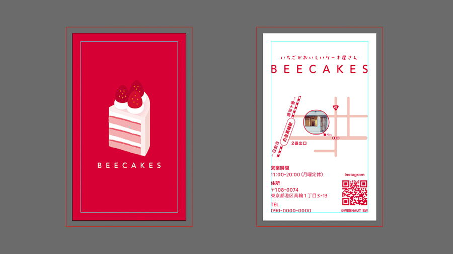 まず、ショップカードに入れる情報を整理して、お店のコンセプトや世界観をしっかり伝えられるデザインを作成しましょう。お店の強みである、こだわりのいちごスイーツをデザインに取り入れ、店舖名・ロゴ・住所・連絡先・営業時間・地図・SNSのQRコードの情報を掲載します。