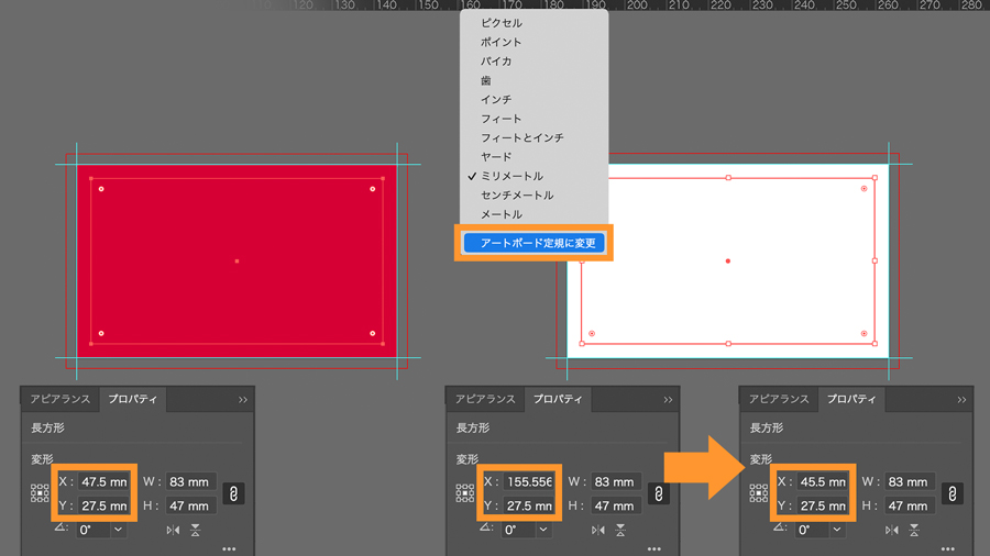 左のアートボードのガイドを選択し、プロパティパネルで座標を確認すると「X:47.5mm、Y:27.5mm」となっています。右のアートボードのガイドを確認すると、「X:155.556mm、Y:27.5mm」と違う数値になっています。