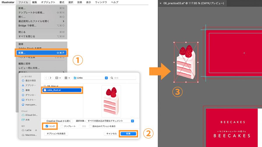 ①「ファイル」メニュー →「配置」を選択し、サンプルファイルの「Links」フォルダーから「cake_illust.ai」を選択します。 この時に「リンク」にチェックを入れると、イラストのパスを読み込まずにデータを軽くすることができます。