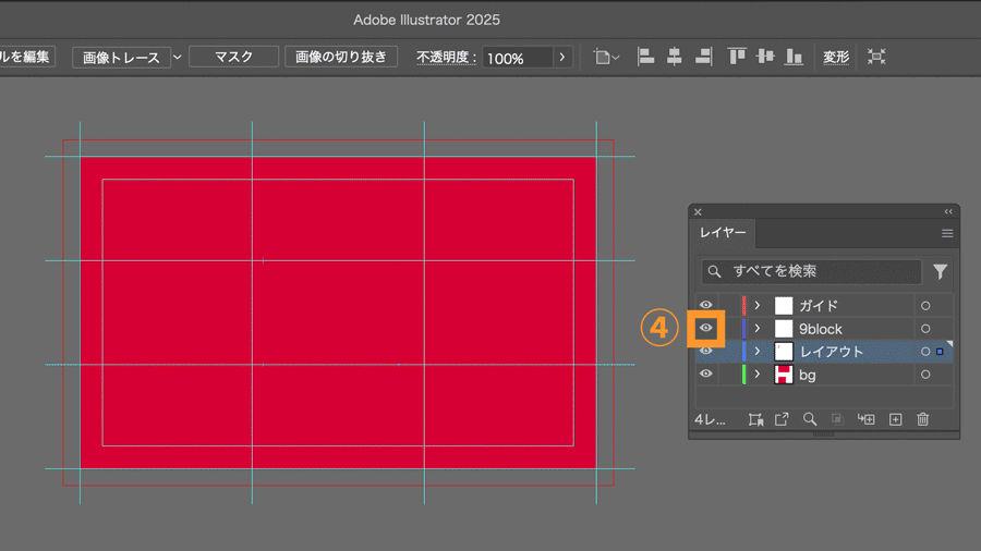 ④「ウィンドウ」メニュー →「レイヤー」を選択し、レイヤーパネルを開きます。「9block」レイヤーの左側の四角をクリックして目のアイコン表示に切り替え、3分割ガイドを表示させます。