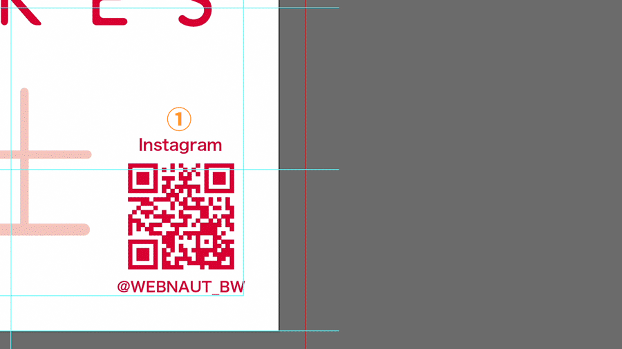 ④QRコードの上下2mmの位置に「Instagram」、「@WEBNAUT_BW」が配置されるように調整します。この時、「表示」メニュー→「アウトライン」にしてQRコード周囲の長方形の線を表示させると調整しやすくなります。
