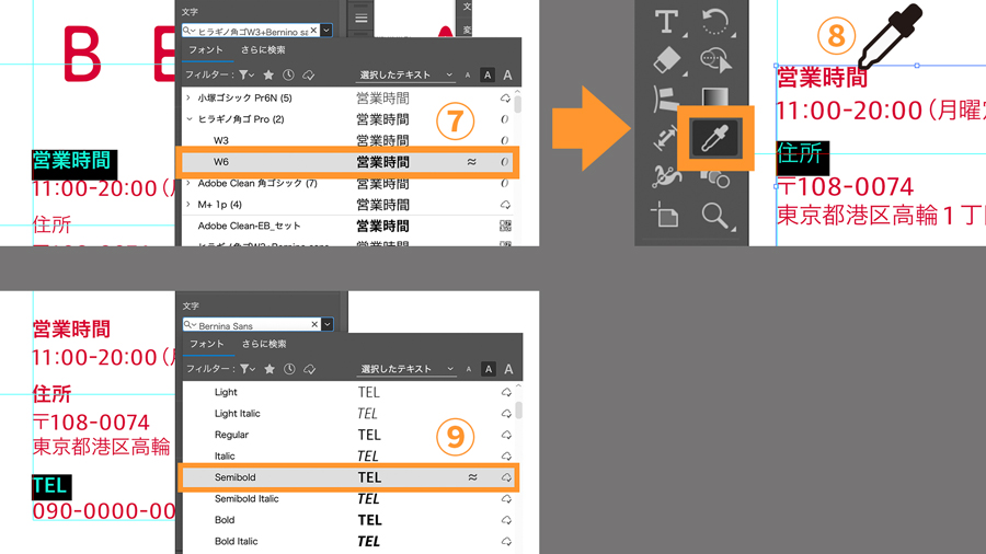 ⑧「住所」も同じW6にします。文字ツールで「住所」を選択した状態で、「スポイトツール」に持ち替え「営業時間」をクリックすると、同じ「ヒラギノ角ゴ Pro:W6」に設定されます。