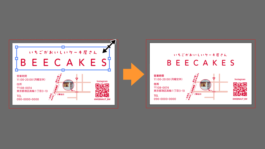 続いて裏面の素材も配置します。まず上にロゴ、下に住所、地図、QRコードを配置し、それぞれを細かく調整していきます。