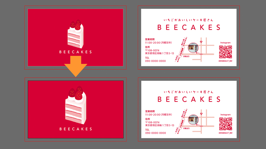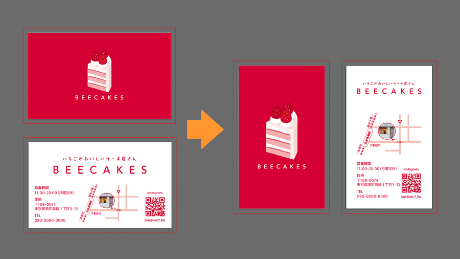 横型のレイアウトと縦型のレイアウトを比較してみましょう。横型はケーキの左右は余白が空きすぎていて、上下はややきつく見えます。縦型はケーキを大きくしただけでなく、四方の余白がしっかりと取れているので、より印象的に見えます。裏面を見比べてみても、縦型は地図が大きくなったので、文字が見やすくなりました。ロゴ周りの余白もしっかり取れており、さらに左右の幅が揃っているすっきりした印象になりました。