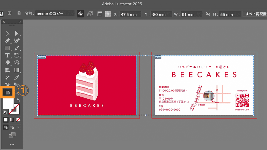 ①QRコード周りのレイアウトを調整します。QRコードは12mm×12mmの大きさになっており、上に「Instagram」、下にID「@WEBNAUT_BW」のテキストを配置しましたが、QRコードの周囲は2mm空ける必要があります。
