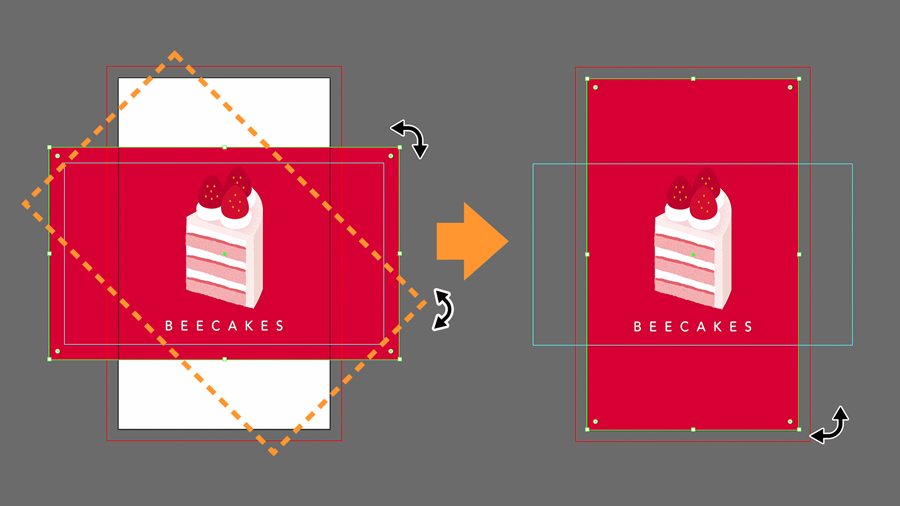③表面の赤の背景色やガイドは、バウンディングボックスを90度回転させます。Shiftキーを押しながらドラッグすると45度ずつ回転するので、2度ドラッグすると90度回転します。