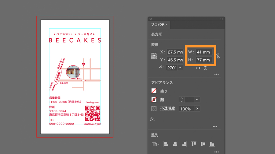 裏面のアートボードのガイドを選択し、「プロパティ」パネルの「変形」の項目で「W:41mm、H:77mm」に変更し、周囲のマージンを4mmから7mmに広げます。
