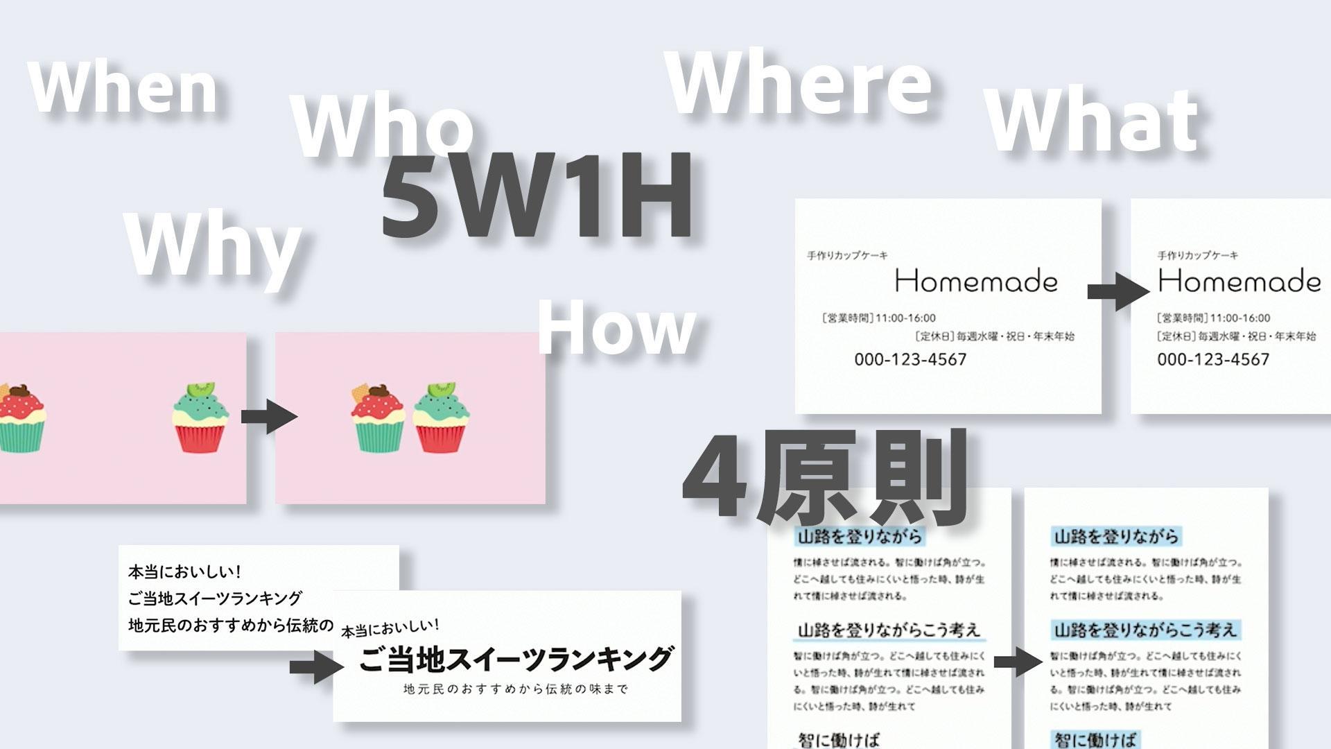 情報を整理するための「5W1H」、整理した情報をより伝わりやすくレイアウトするための「デザインの4原則」。これらを用いてデザインを考えることで、迷いが生じづらくなり効率的に作業が進みます。