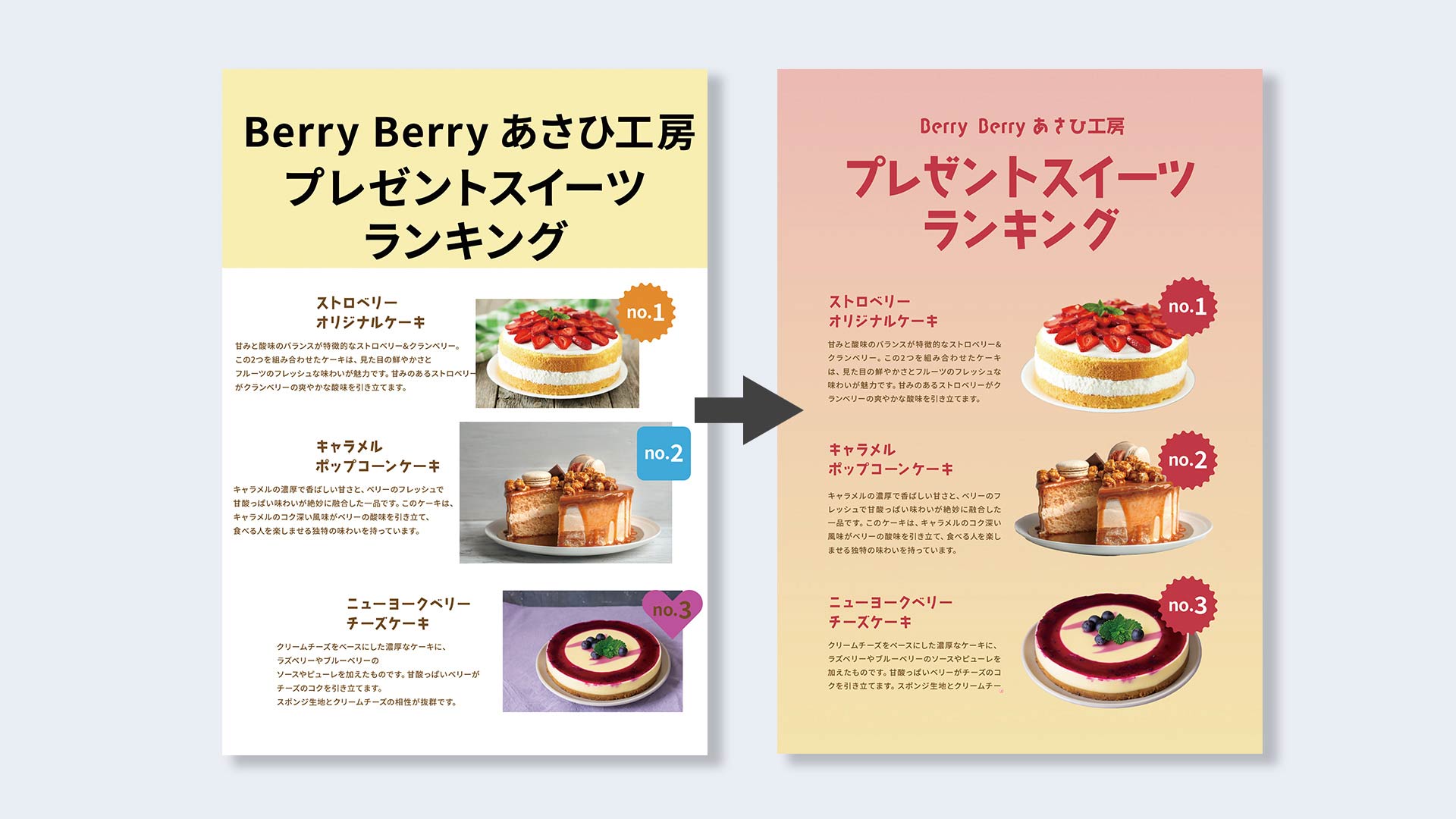 同様に、タイトルの「プレゼントスイーツランキング」、および3つのケーキの見出し文字にも同じフォントとカラーを適用します。さらにマークも同じカラーで統一します。