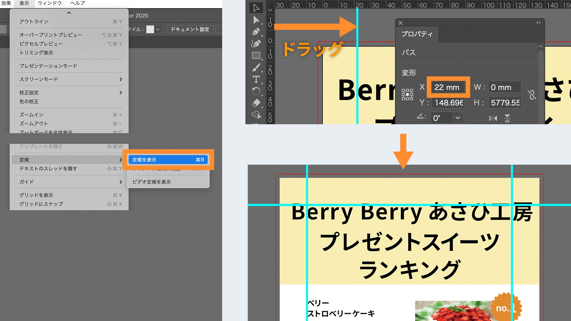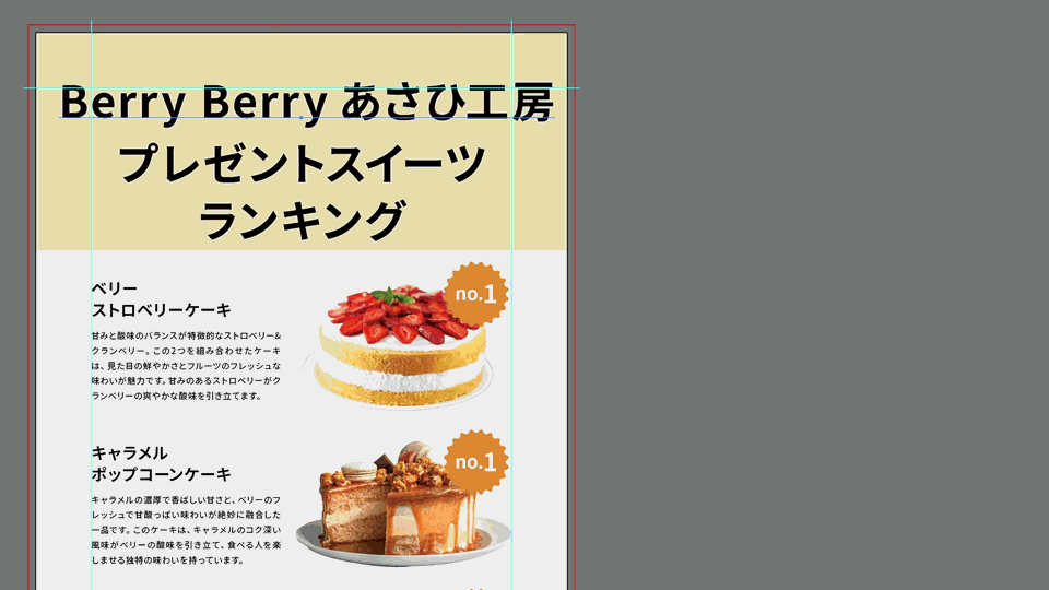 ➃ 「ベリーストロベリーケーキ」の見出しテキストを選択し、Shiftキーを押しながら水平右方向にドラッグして、テキストボックスの左端を垂直のガイドラインに合わせます。