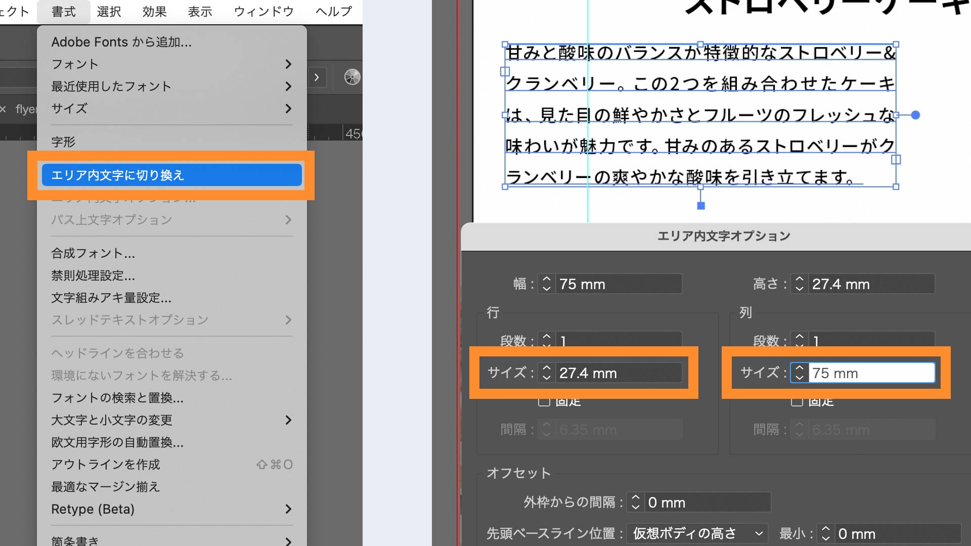 ➂ エリア内文字を選択した状態で、[書式 ➡ エリア内文字オプション]を選択し、ダイアログボックスの行/サイズを27.4mmに、列/サイズを75mmに変更します。