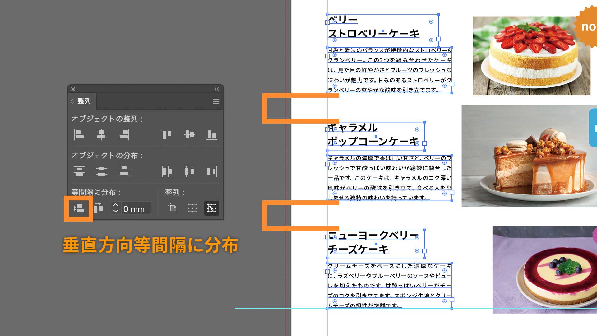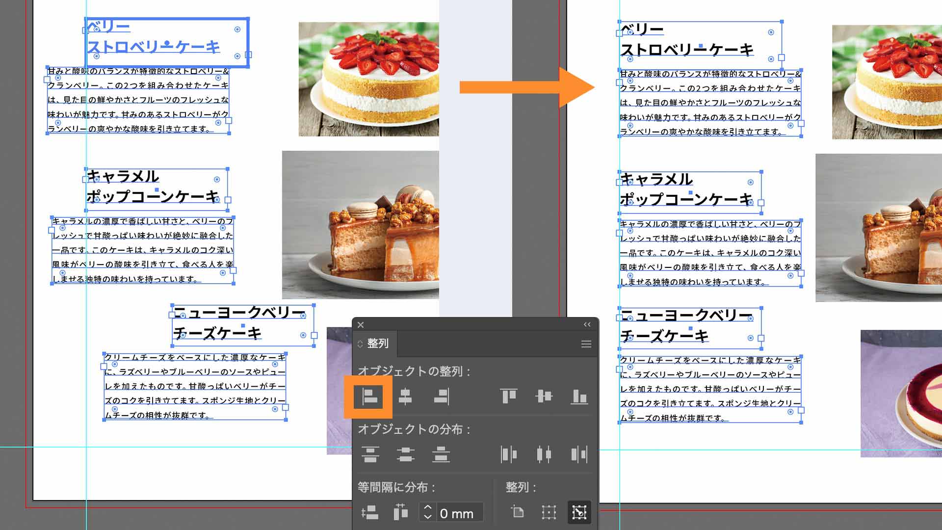 ⑥ [ウィンドウ ➡ 整列]から整列パネルを開き、オブジェクトの整列/水平方向左に整列をクリックすると、「ベリーストロベリーケーキ」の見出しテキストの左端に合わせて、他の全てのテキストが自動的に整列します。