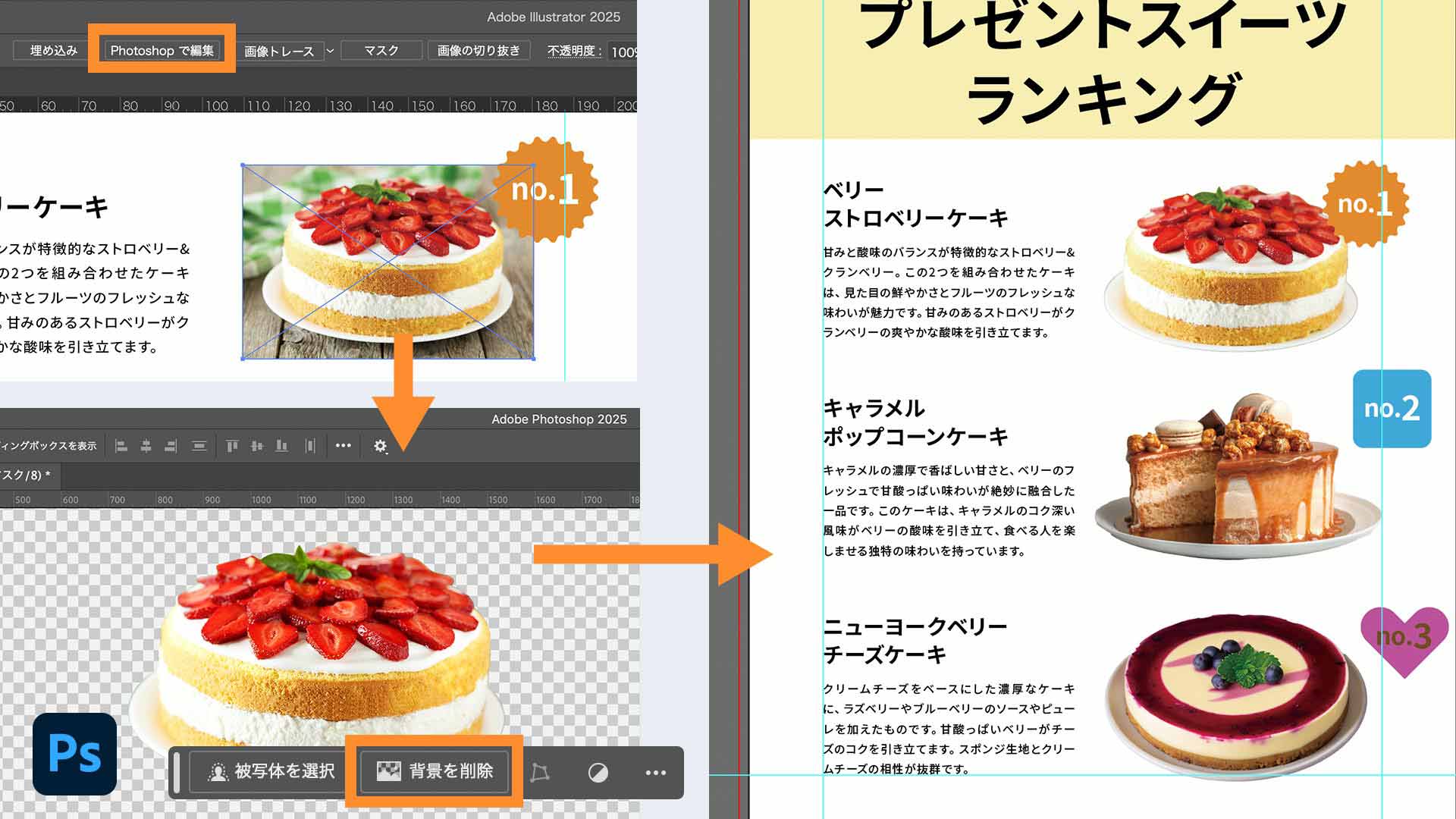 それぞれのケーキの写真が角版で配置されており、背景に統一感がないため、切り抜き画像に変更します。画像の切り抜きはPhotoshopでおこないます。