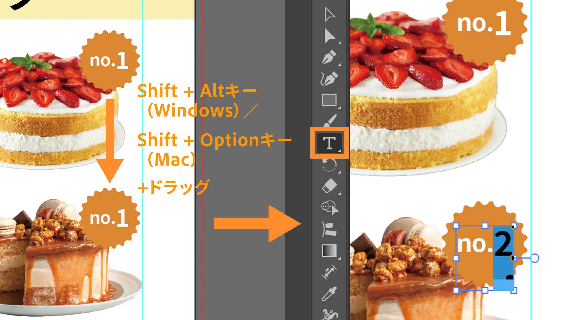 ➂ no.1マークを選択した状態で、Shift + Altキー(Windows)またはShift + Optionキー(Mac)を押しながら下方向にドラッグし、2番目と3番目のケーキの写真のそばにコピーを2つ作成します。
