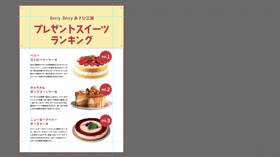 3つのケーキを説明する本文テキストがバラバラに配置されているため、デザインの4原則「整列」に則って、位置や行長を均等にそろえます。本文テキストは現在、ポイント文字になっているため、これをエリア内文字に変換することで調整がしやすくなります。