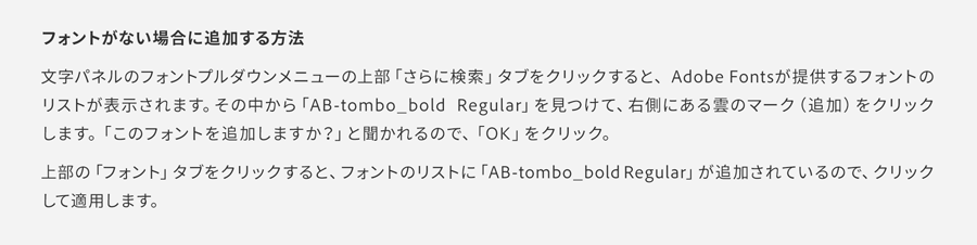 ② フォント名の横にあるプルダウンメニューを開き、ここでは「AB-tombo_bold Regular」というフォントを適用します。