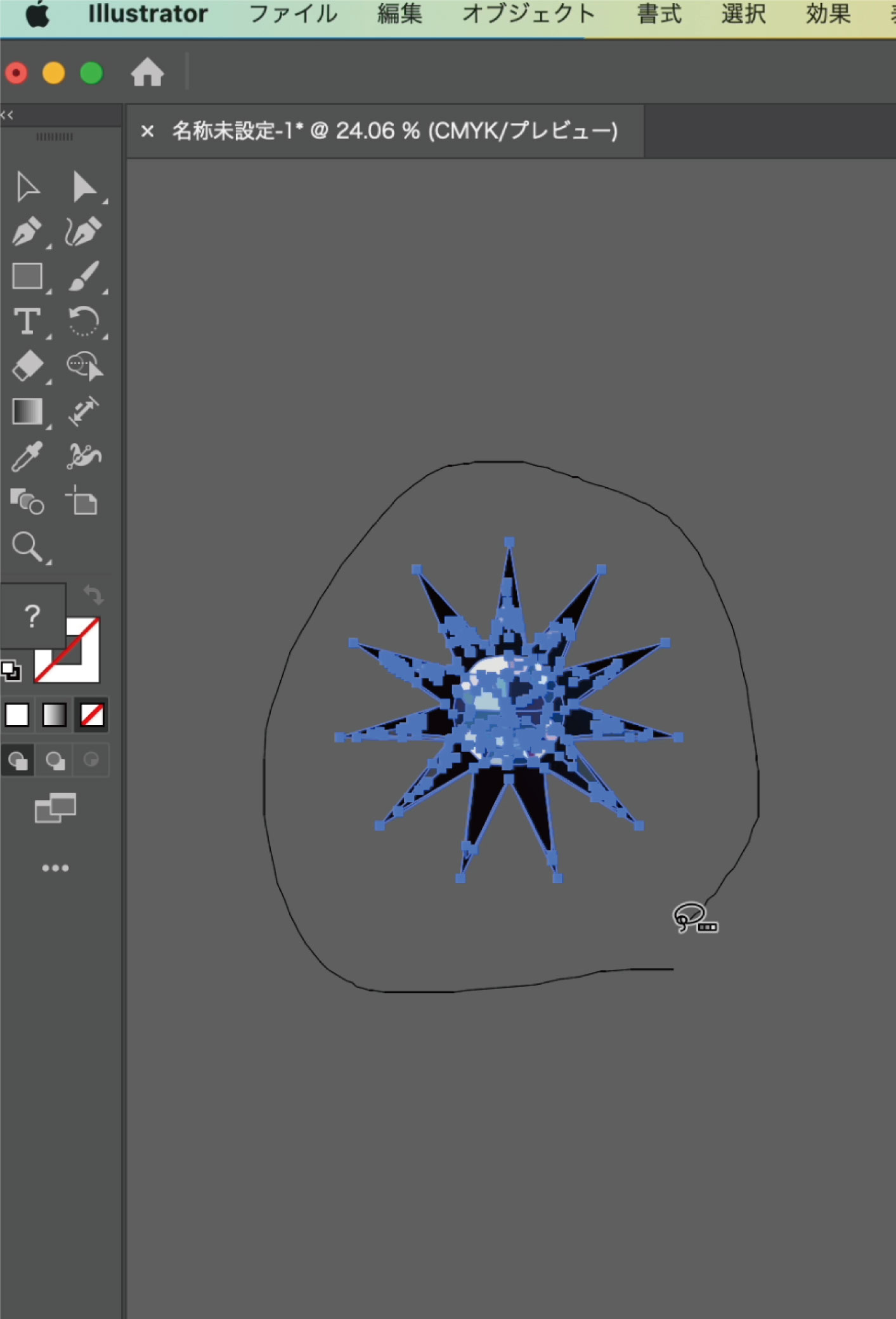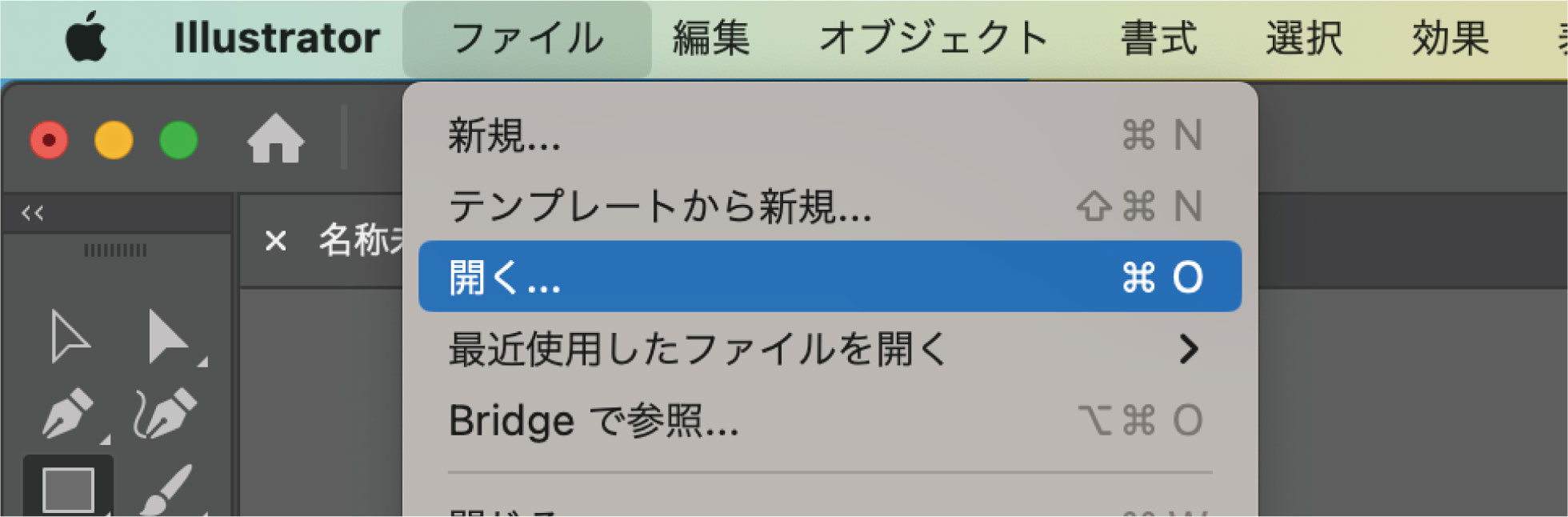 Illustratorを起動し、「ファイル」→「開く」からダウンロードした素材ファイル「shape_before_02.ai」を選択して開きます。