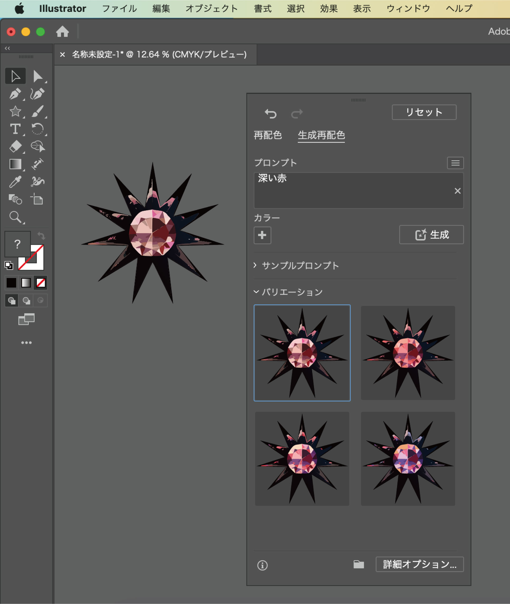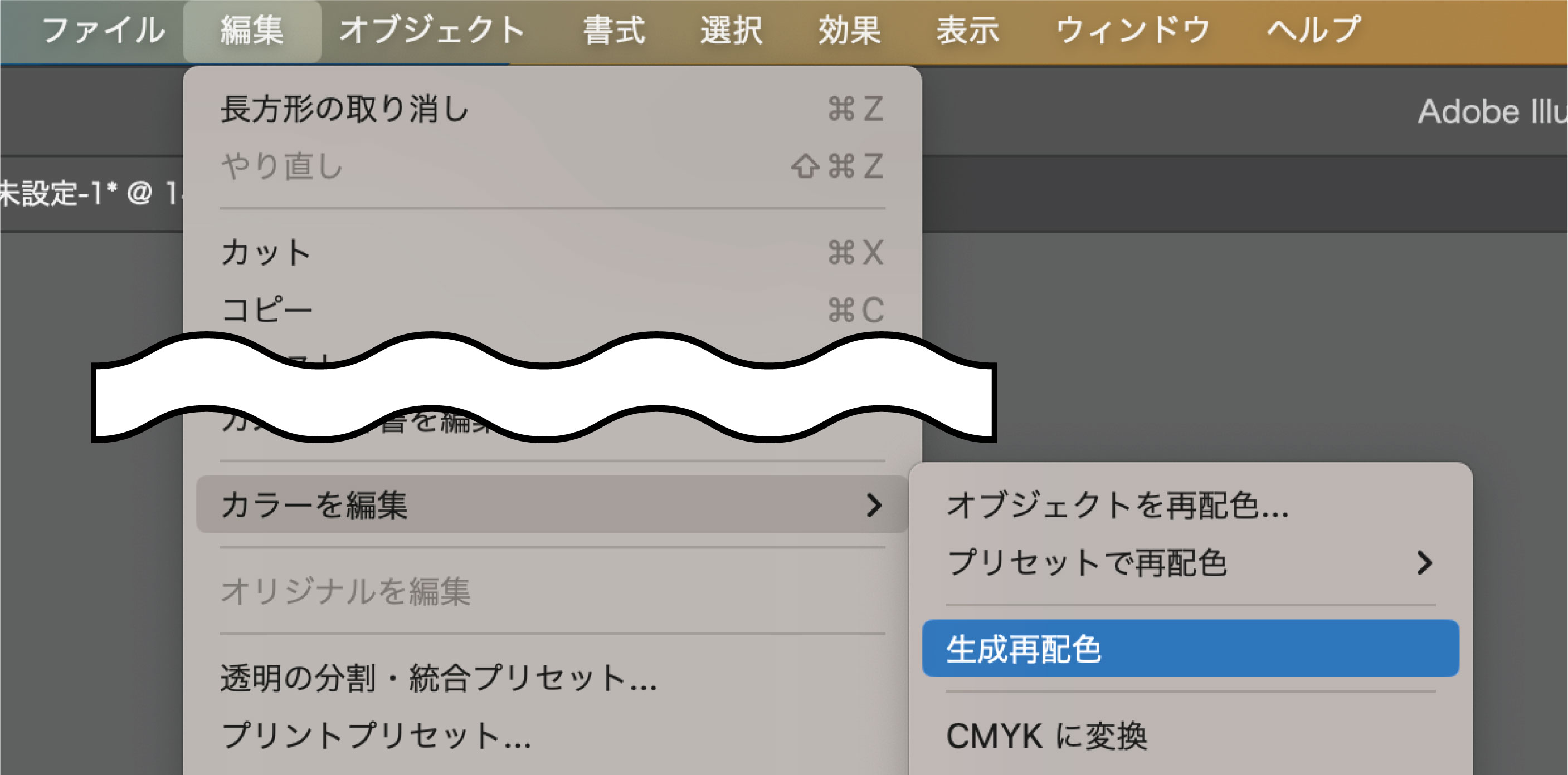 パターンを選択した状態で、上のメニューから「編集」>「カラーを編集」>「生成再配色」を選択して、生成再配色のパネルを開きます。