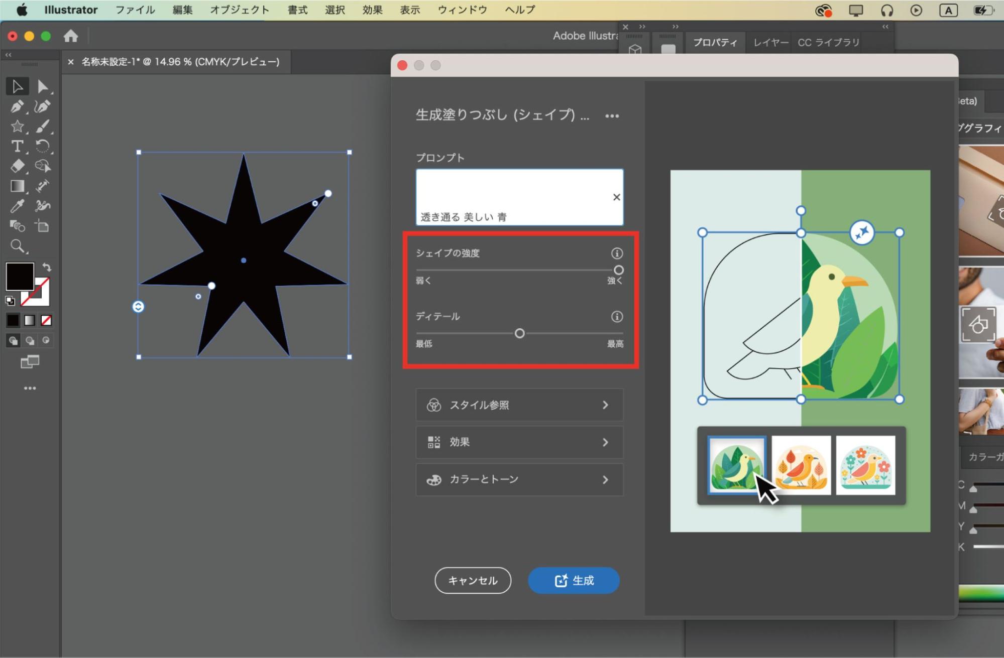 シェイプを選択した状態で、コンテキストタスクバーまたはプロパティパネルから「生成塗りつぶし (シェイプ)」を選択して、プロンプトフィールドに好きなキーワードを入力します。ここでは「透き通る 美しい 青」と入力しています。