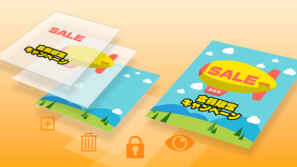 レイヤーとは一枚の透明なフィルムのようなもので、要素が追加された複数のレイヤーを重ねることで一つの画像を作り上げます。何枚でも重ねて、画像やテキスト、図版などの要素を個別に配置することができます。