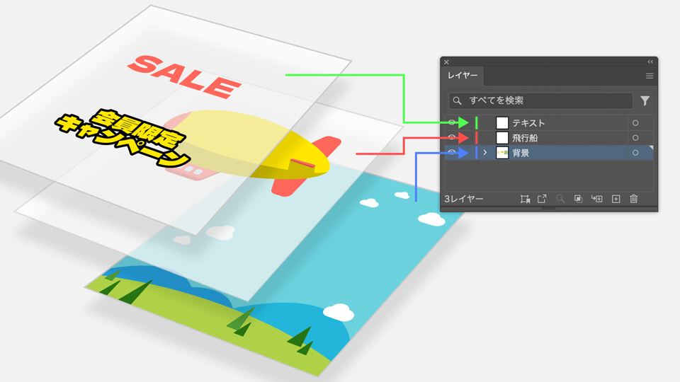 「テキスト」レイヤーをドラッグして、「飛行船」レイヤーと「背景」レイヤーの間にドロップします。他のレイヤーの順番も入れ替えて、レイヤーの階層構造を理解しましょう。