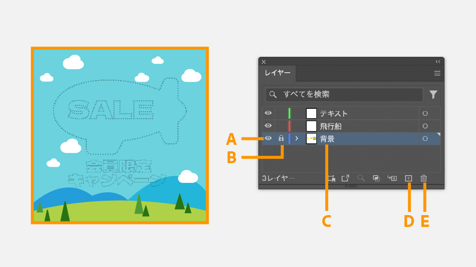 3つのレイヤーを一つずつ選択し、表示の切り替え、ロックを切り替え、レイヤー名の変更を試してみましょう。ここでは、「テキスト」「飛行船」「背景」と変更します。