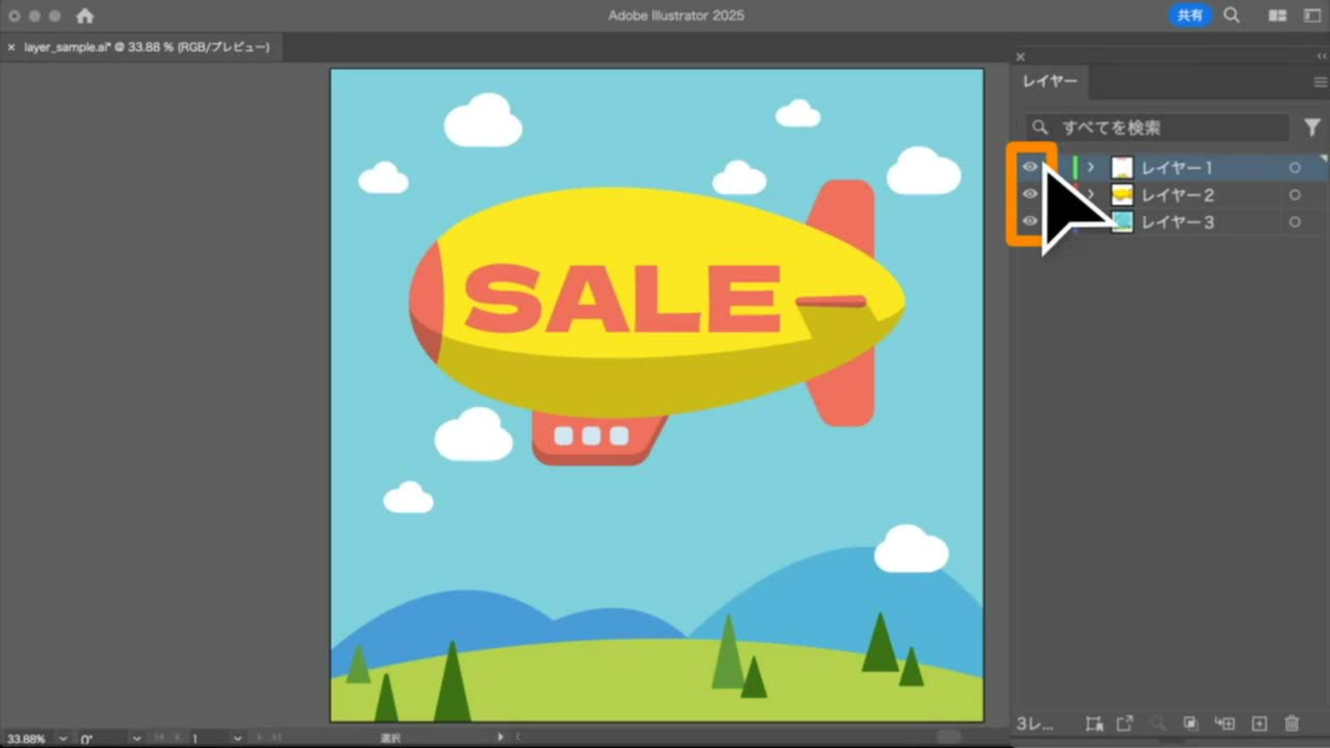 目のアイコンが表示されているときは、そのレイヤーにあるアイテムが表示されていることを示します。アイコンをクリックすると非表示になり、レイヤーのアイテムが全て非表示になります。このレイヤーにどのようなアイテムが含まれているか確認するときや、バリエーションを比較したりするときなどに便利です。