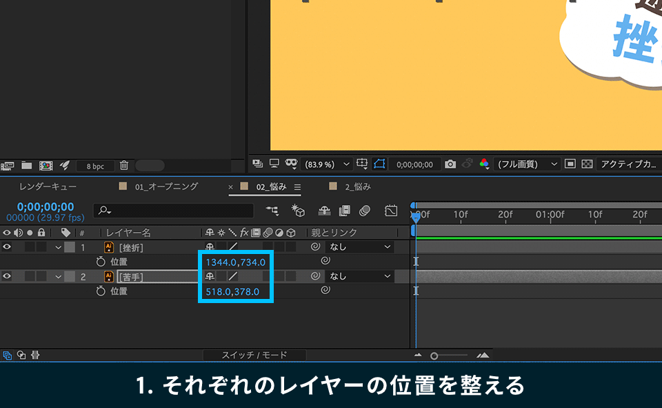 新しいコンポジションに、2コマ目の「悩み」のシーンを編集していきます。