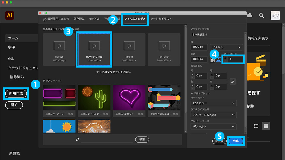 3. 「空のドキュメントプリセット」から「HDV/HDTV 1080」を選択し、右側の「プリセットの詳細」でアートボードの数を「4」に設定して「作成」をクリックします。