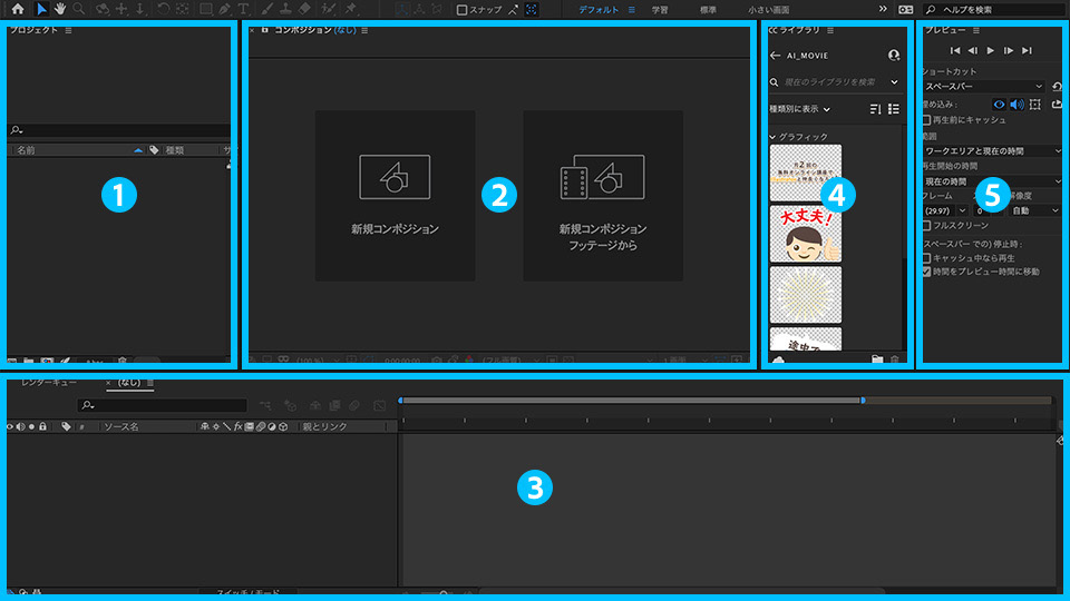❸ タイムラインパネル:素材をレイヤーとして配置し、時間軸に沿って合成やアニメーションなどの設定を行います。