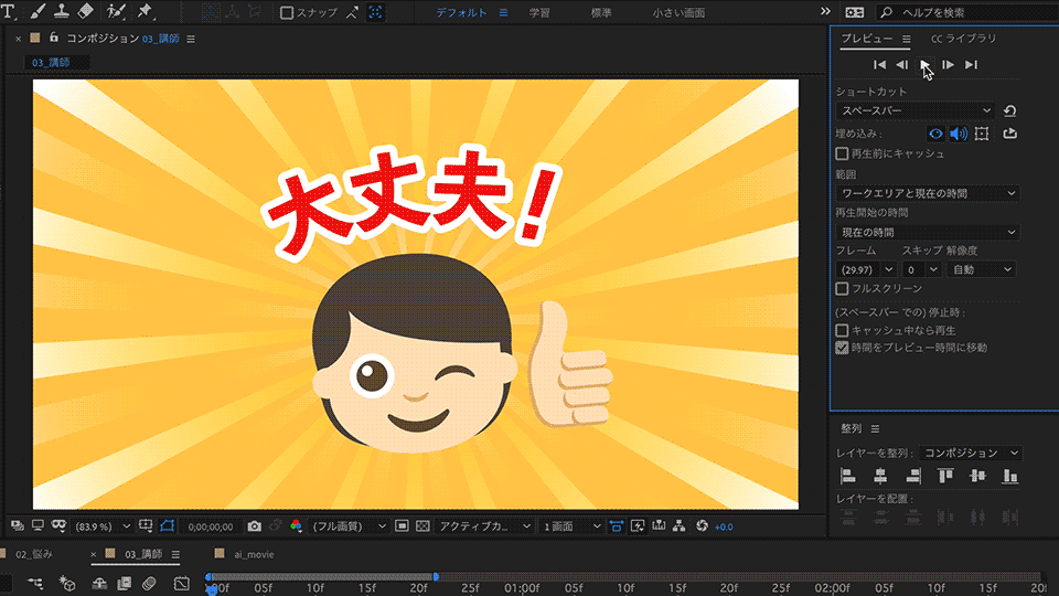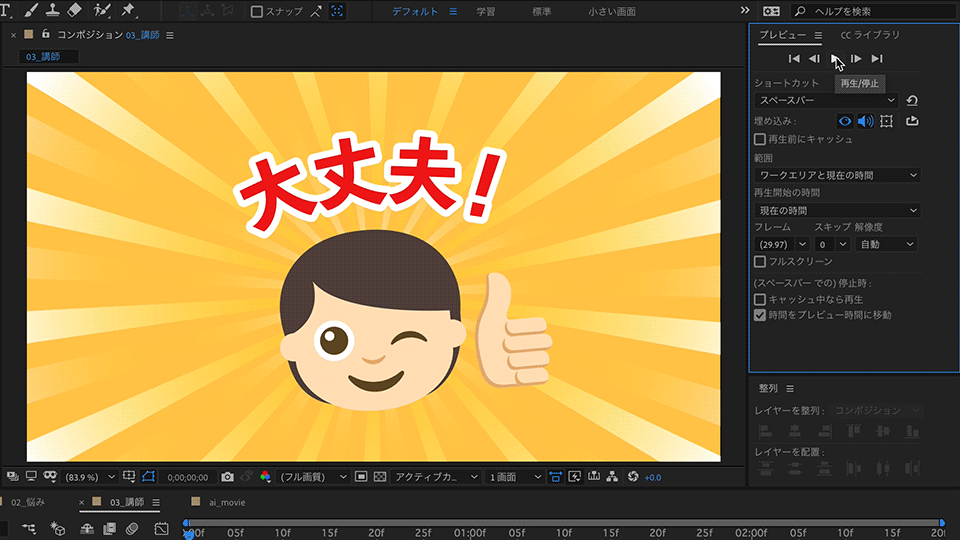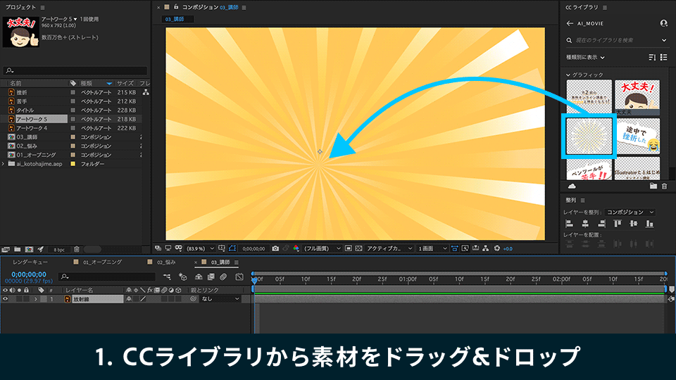 2. CCライブラリからコンポジションパネルに「放射線」と「大丈夫」をドラッグ&ドロップで配置し、それぞれ整列パネルの「「水平方向に整列」と「垂直方向に整列」を順番に押して画面中央に配置します。