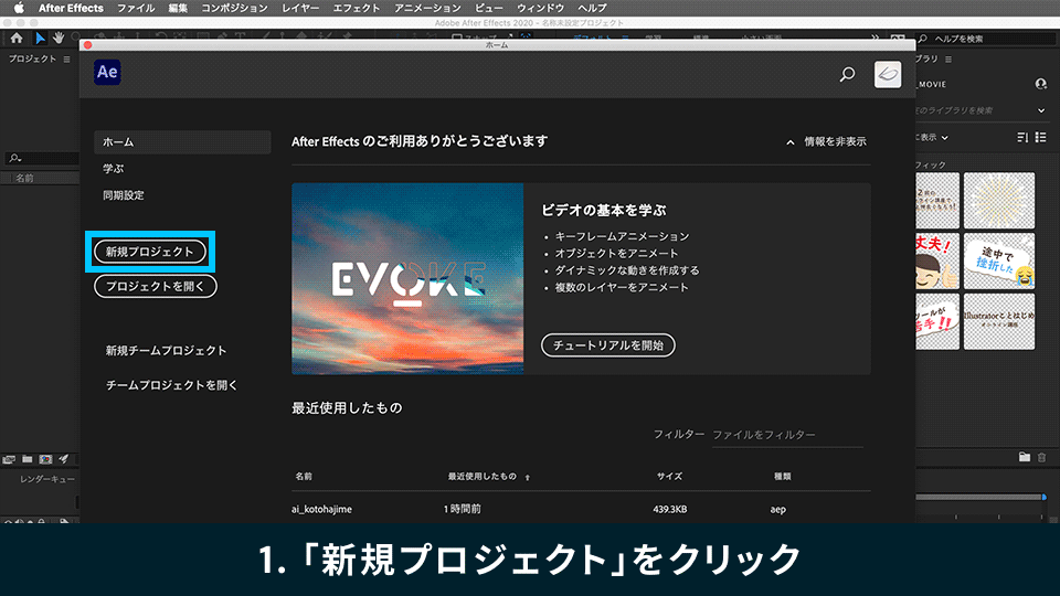 1. After Effectsを起動し、「ファイル」→「新規」→「新規プロジェクト」を選択します。