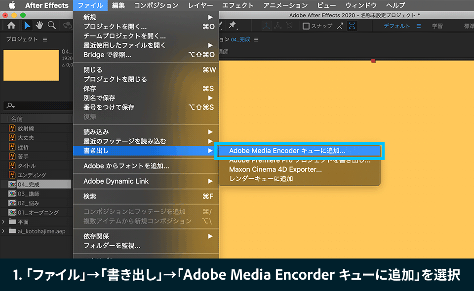 1. 「ファイル」→「書き出し」→「Adobe Media Encoder キューに追加」を選択すると、Adobe Media Encoderが起動します。
