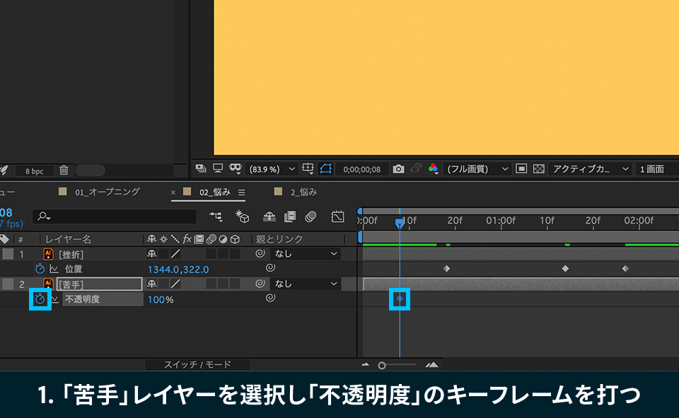 14. 「0;00;00;08」でストップウォッチマークをクリックし、不透明度を「0%」に設定します。