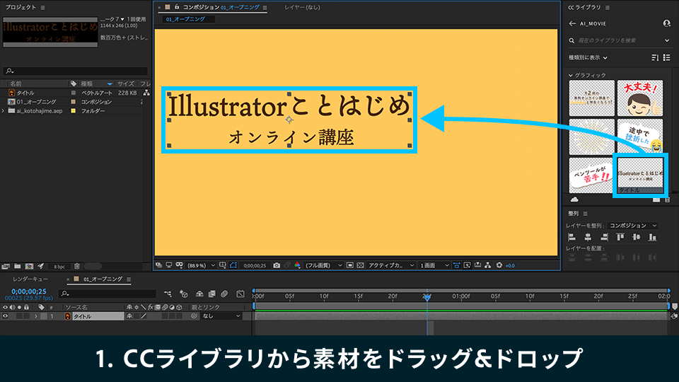 3. パネル内にIllustratorで登録した素材が表示されます。その中から「オープニング」を選択し、コンポジションパネルにドラッグ&ドロップで配置します。