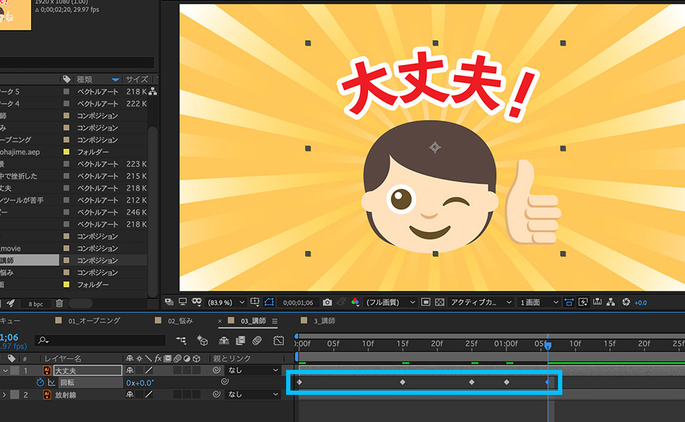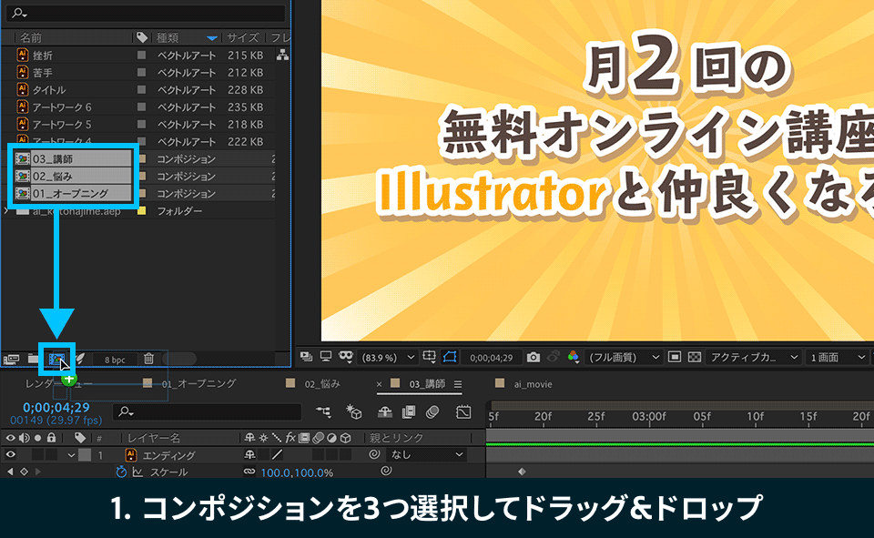 1. プロジェクトでパネルで、「01_オープニング」「02_悩み」「03_講師」の3つのコンポジションを順番に選択します。