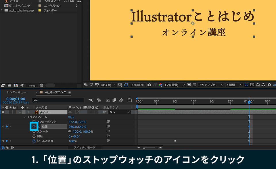 6. 次に、時間インジケータを「0;00;01;00」まで移動し、トランスフォームの「位置」のストップウォッチマークをクリックします。